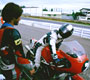 | 第一ライダーは本田さん。ルマン式にスタート。合図と同時にバイクに駆け寄り、エンジンを始動して走り出す。 上手くスタートして、どうやら順位を上げたようだ。 順調に周回を重ねて、森さんと交代。一人20分ずつ2度走るローテイションである。 しかし、前に間瀬で起こったフロントブレイキのトラブルが発生。急にブレイキストロウクが伸びて、二度引きをしないと効かなくなるのである。僕も、その症状が最初に起こったとき、バックストレイトエンドで大丈夫だったから安心していたところ、その次の右コーナーでいきなりノーブレイキ状態。慌てて、3度ほどレヴァを握り直すと、やっとブレイキが掛かった。もう少しで、コースアウトであった。 以後は、コーナー手前から軽くレヴァを引いて、圧力を確認しながら走った。これが無ければ、きっとあと1-1.5秒らいはタイムが縮められたに違いない(僕のベストタイムは、1分15秒144だった)。 来年に期待しよう。 |